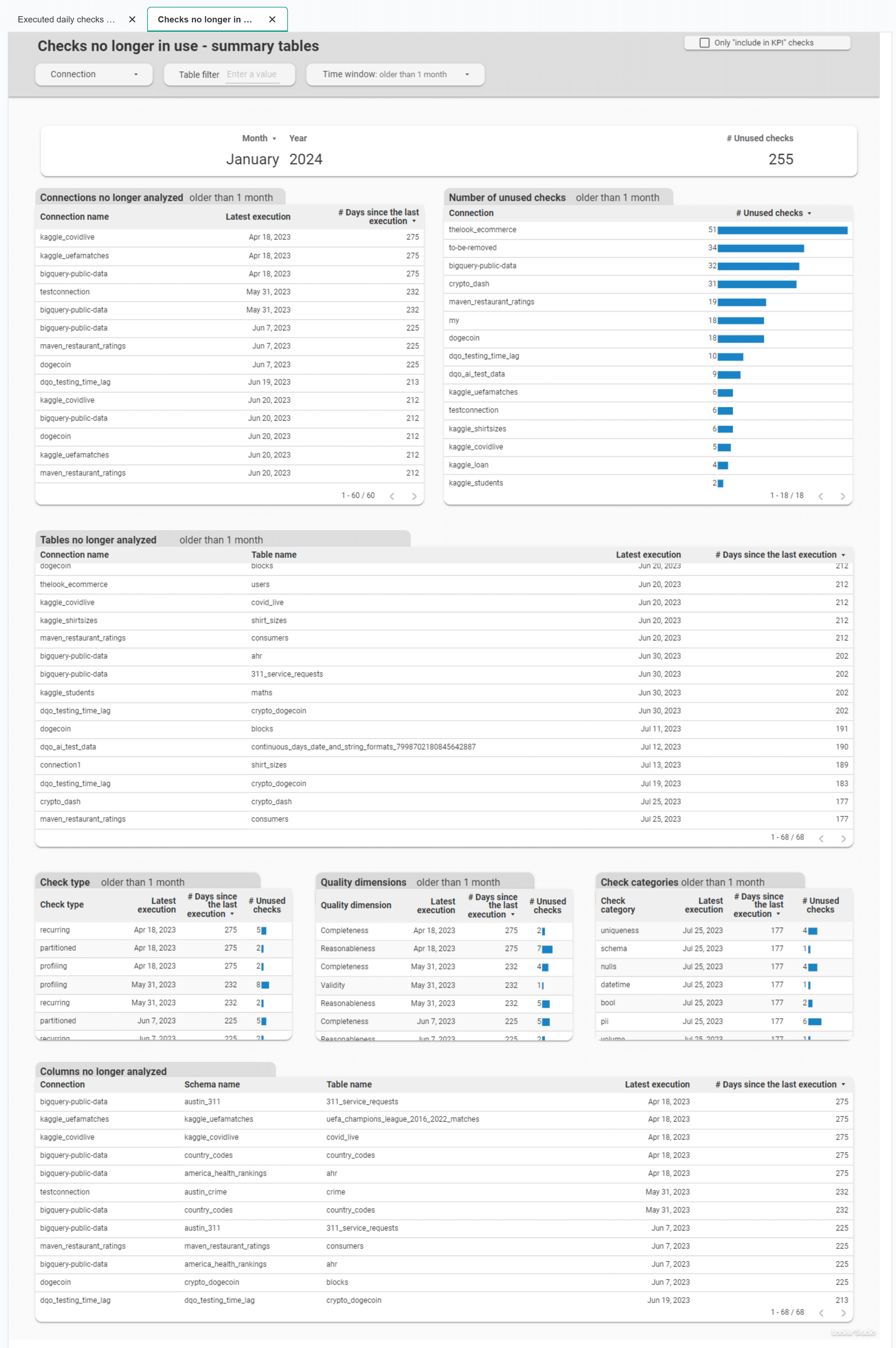 Checks no longer in use - summary table dashboard shows summary tables of checks that are no longer in use.