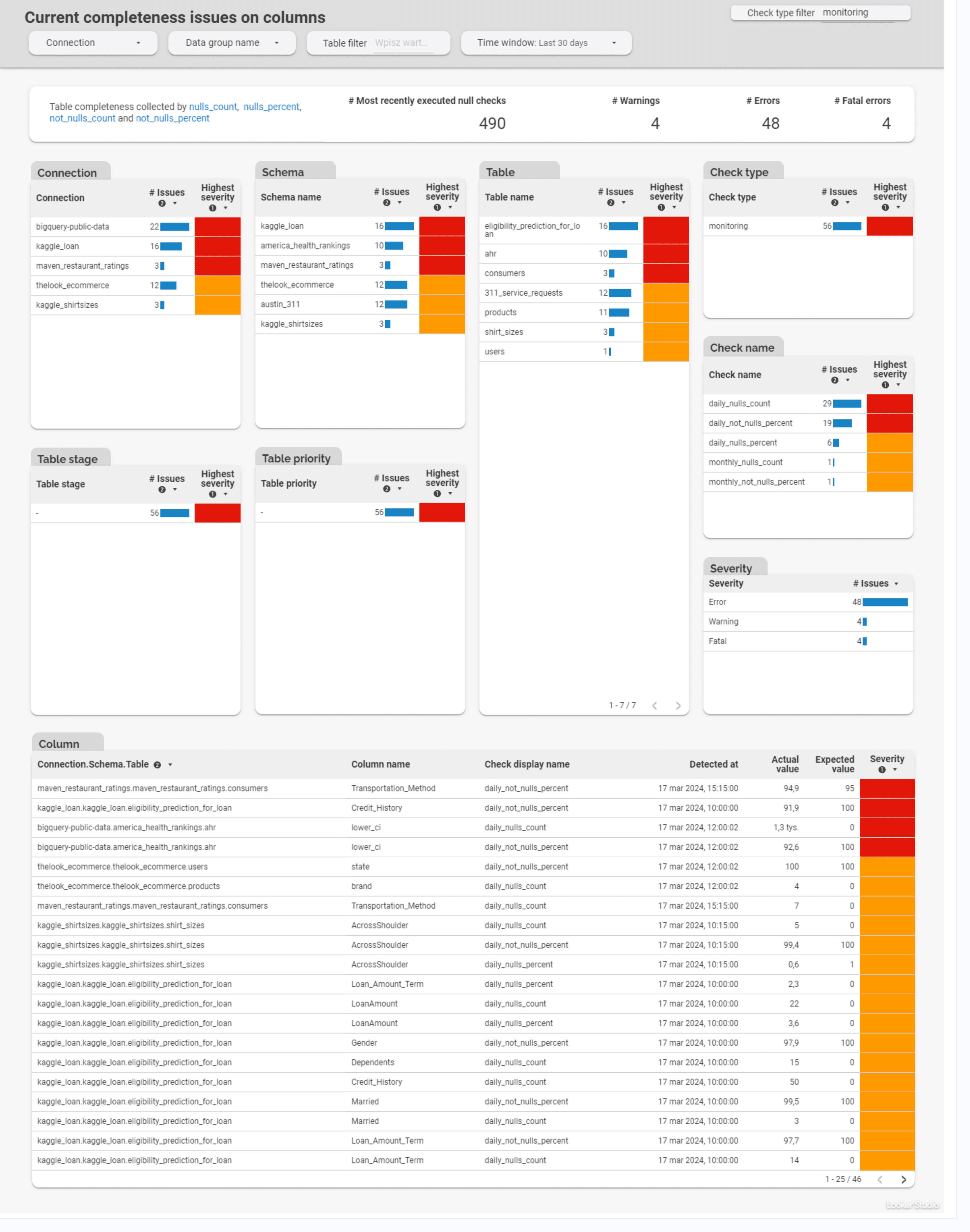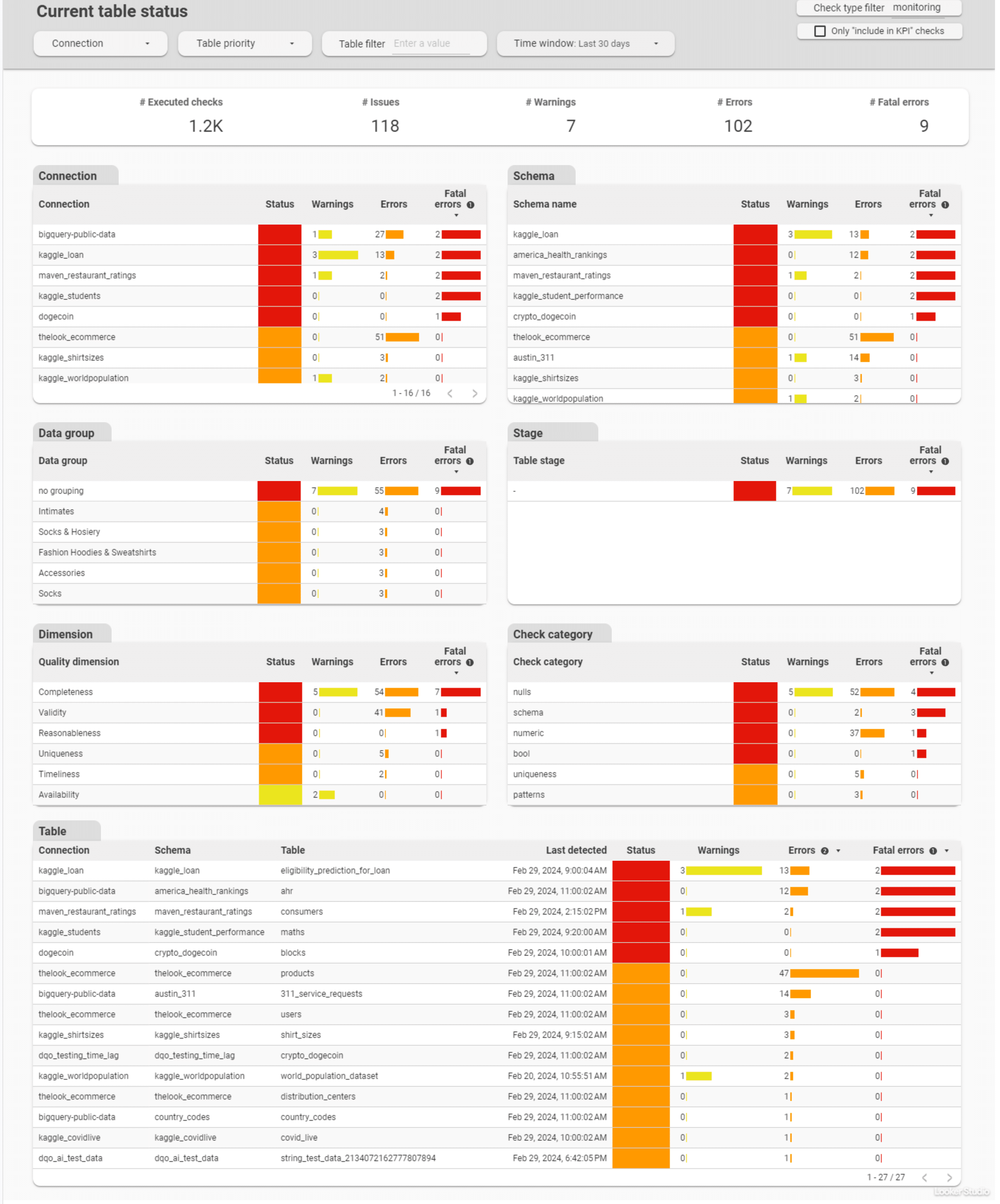 Data quality issues count advanced dashboards allow evaluation of the number issues and its severity level per table, or per check category. Another two types of dashboards in this subgroup allows reviewing the total number of failed checks (warning, error, fatal) per day of the month, or per table and day of the month.
