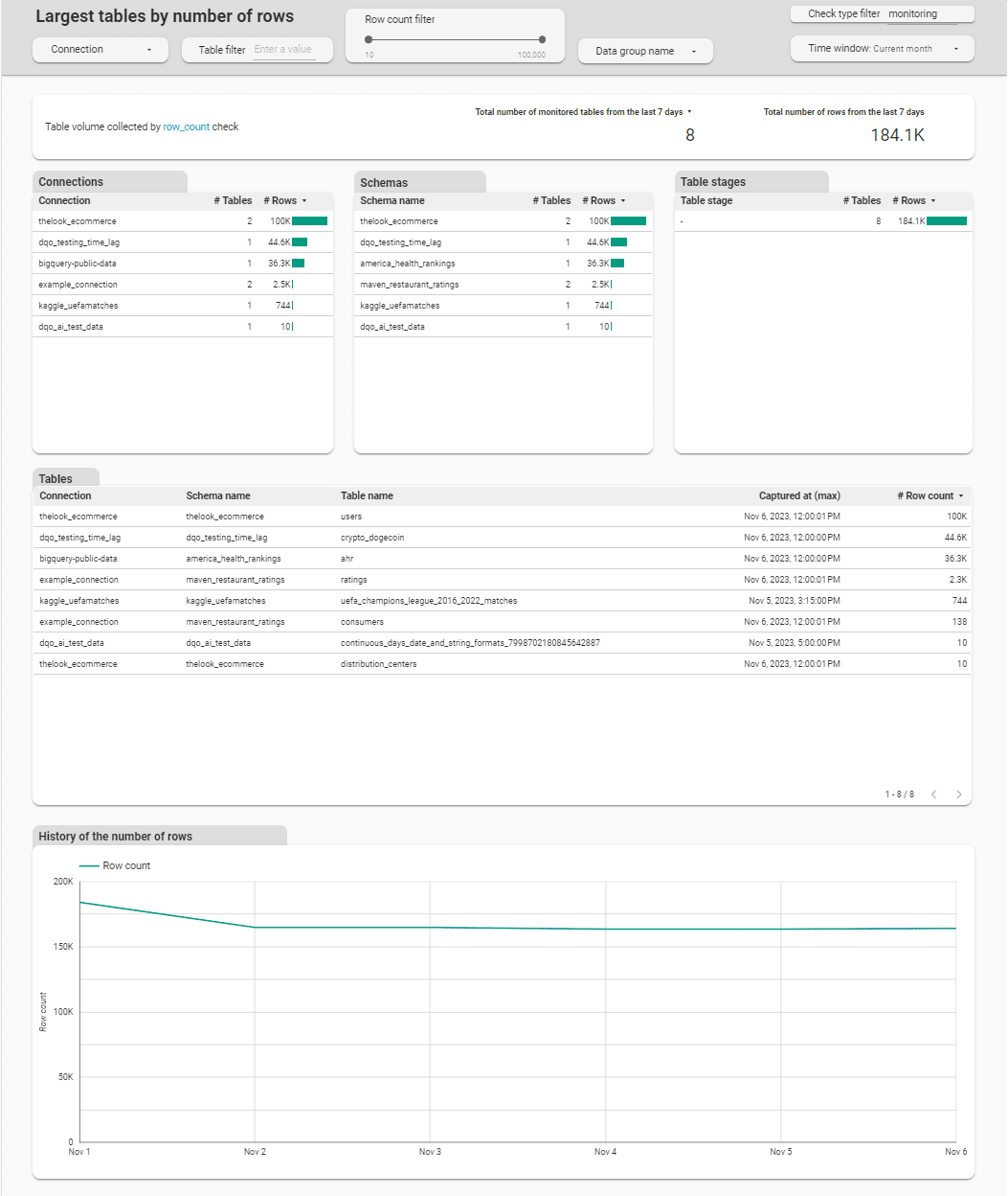 Largest tables by number of rows is a representative of Volume subgroup. This dashboard displays tables monitored with row_count check and allows review the number of rows in these tables.