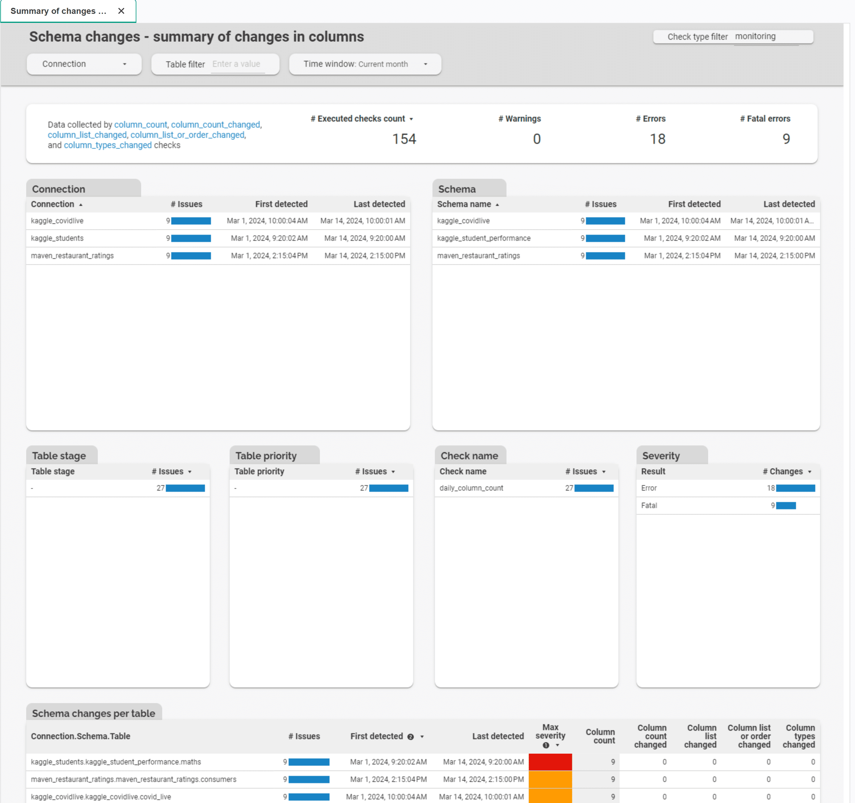Summary of changes in columns is a representative of Schema changes group. This dashboard summarizes issues obtained from all table-level schema change checks (column count, column count changed, column list changed, column list or order changed,, column types changed).