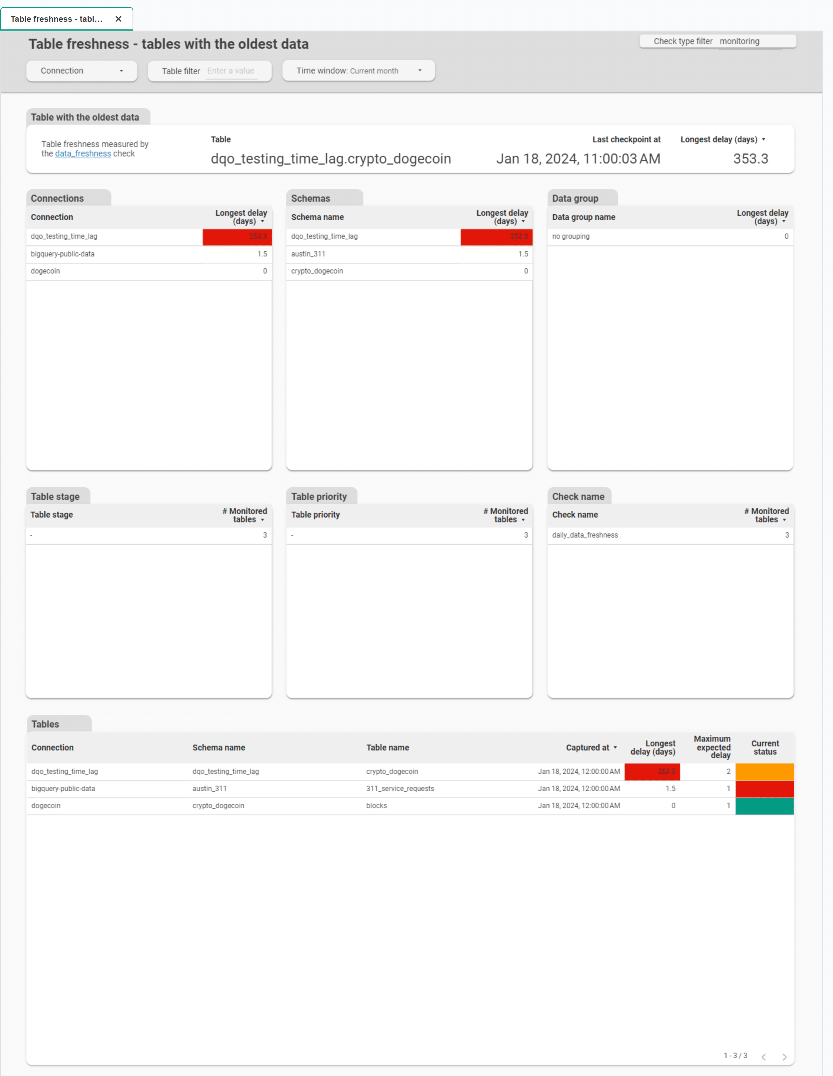 Table freshness - tables with the oldest data is a representative of Timeliness subgroup. This dashboard summarizes tables with the longest delay measured by the table_freshness check.